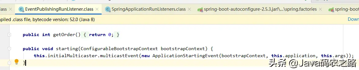 this.getSpringFactoriesInstances(SpringApplicationRunListener.class, types, this, args) 这个方法不仅会加载spring.factories中的类,还会进行实例化。而EventPublishingRunListener 只有一个构造器。