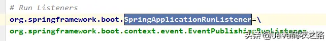 // 从spring.factories中加载key为 SpringApplicationRunListener.class对应的value值 并封装成返回的这个类实例 注意这个spring.factoies是在spring-boot.jar里面的