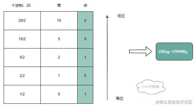 - 整数部分的转换方法是:“除基取余,上右下左”。即用要转换的十进制整数去除以基数R,将得到的余数作为结果数据中各位的数字,直到余数为0为止。上面的余数(先得到的余数) 作为右边低位上的数位,下面的余数作为左边高位上的数位。