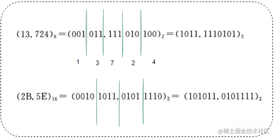 整数部分从低向高每3或4位数用一个等值八/十六进制数替换,不足时高位补0;小数部分从高向低每3或4位数用一个等值八或十六进制数替换,不足时低位补0