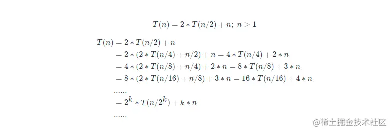 一步步分解推导可得T(n)=2k∗T(n/2k)+k∗n 。当T(n/2k)=T(1) 时,也就是n/2k=1,我们得到k=log2n 。我们将k 值代入上面的公式,得到T(n)=Cn+nlog2n 。如果我们用大 O 标记法来表示的话,T(n) 就等于O(nlogn)。所以归并排序的时间复杂度是O(nlogn)。