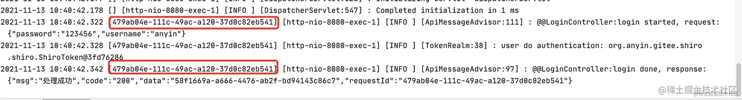 - 一次请求在控制台或者日志文件打印的日志,都需要显示RequestId