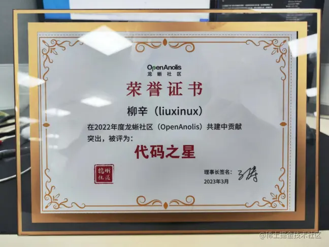在过去的一年,我也获得了 “ 2022 龙蜥社区年度优秀贡献奖-代码之星”奖项,我也会保持热爱,一直为开源贡献出自己的力量。