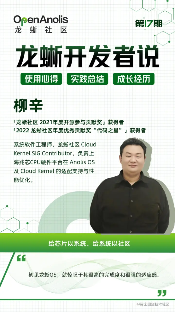 「龙蜥开发者说」第 17 期来了!开发者与开源社区相辅相成,相互成就,这些个人在龙蜥社区的使用心得、实践总结和技术成长经历都是宝贵的,我们希望在这里让更多人看见技术的力量。本期故事,我们邀请了龙蜥社区开发者柳辛来分享「 给芯片以系统、给系统以社区」。