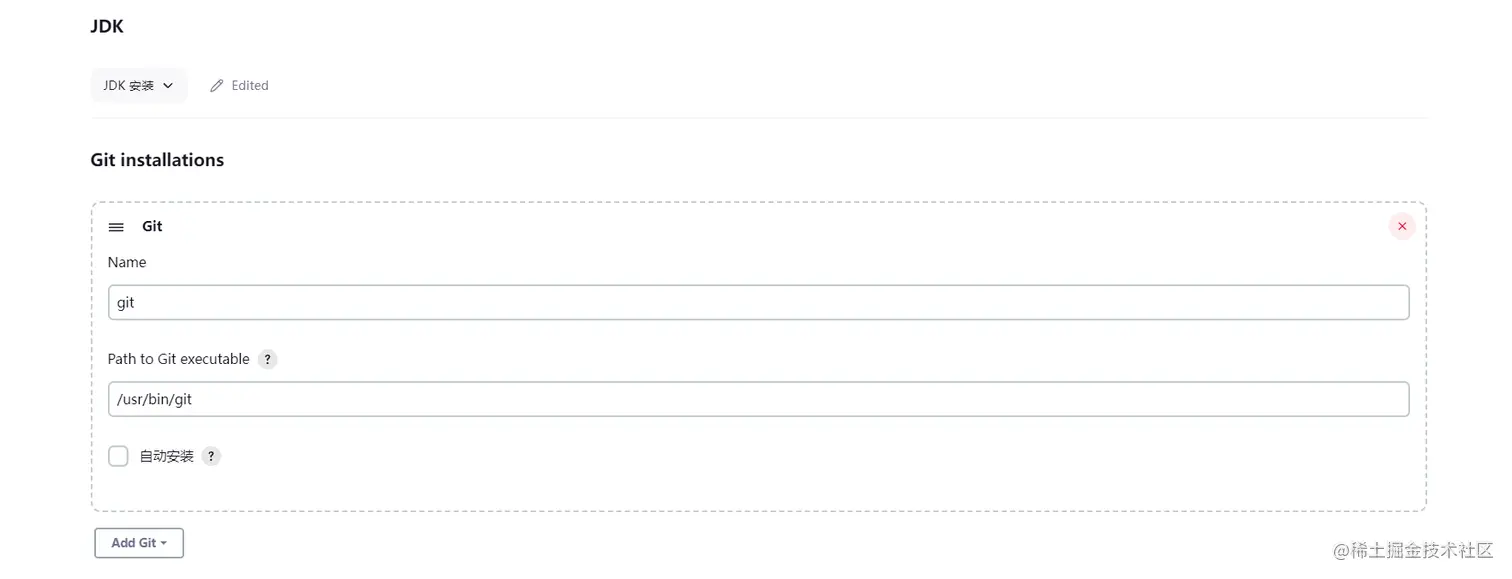 这里注意也可以在本地安装nodejs并使用,如果使用本地环境则此处的nodejs可以不用配置,且在配置前端配置任务时可以不用配置nodejs环境(因为它会默认读取本地环境);