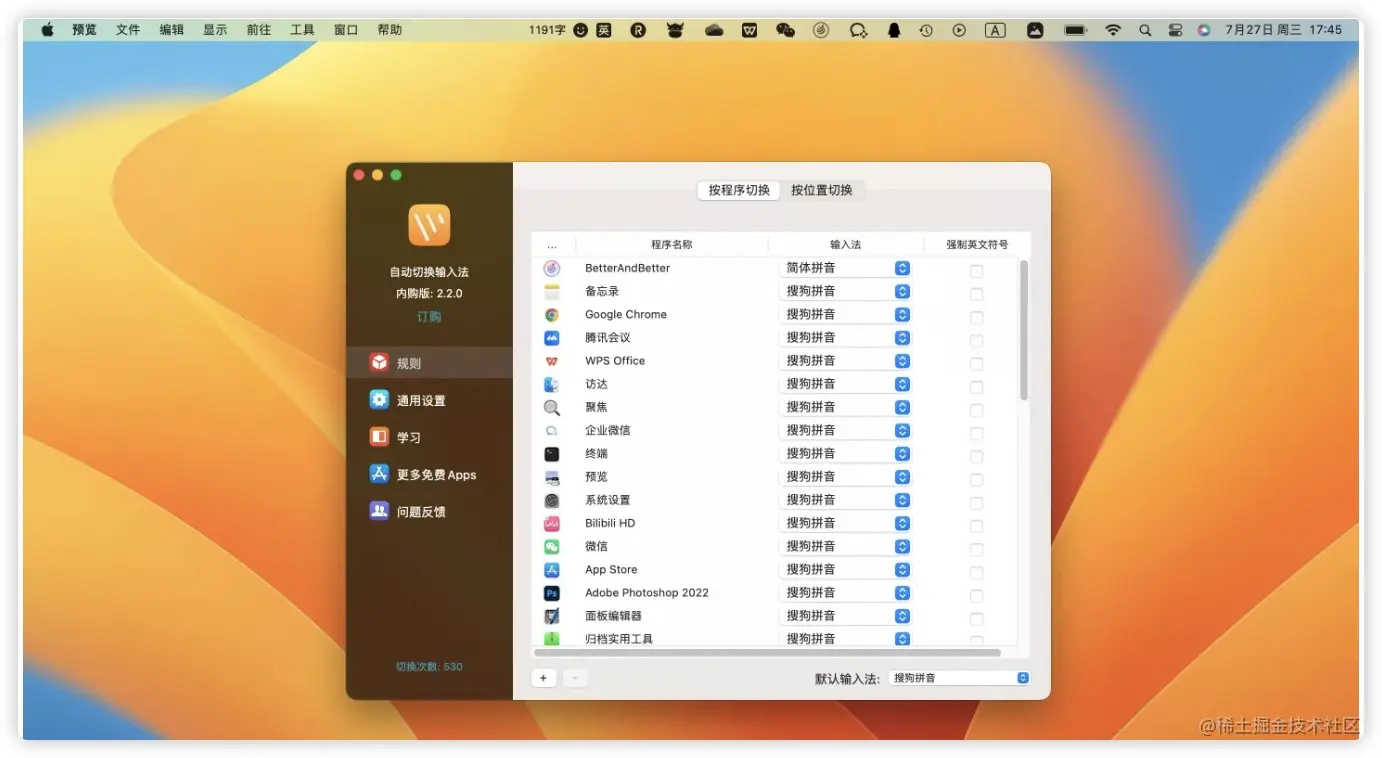 但是,追求效率(懒到不行)的我们并不满足于快捷键,我们想让 Mac 跟我们心有灵犀:当我们打开某个 App 时,它可以自动切换成我们想要的输入法。这个想法可以实现吗