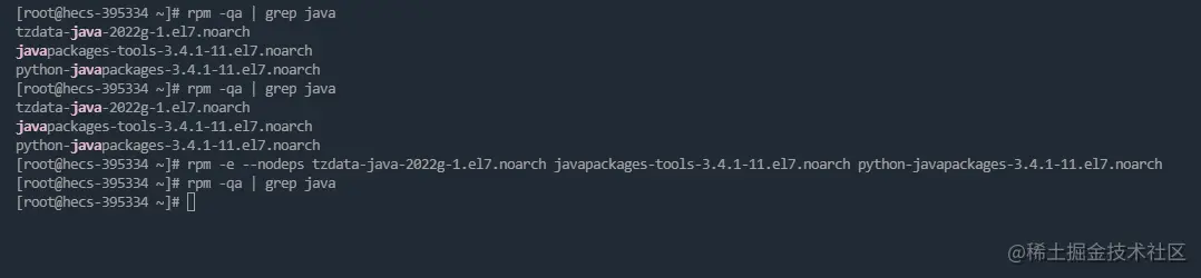 3、接着进行一个个删除包,输入:rpm -e --nodeps +包名 --nodeps是强制删除 4、最后再次:rpm -qa | grep java检查是否删除完即可