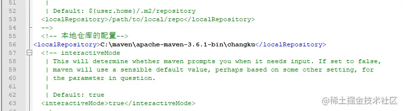 <localRepository>C:\maven\apache-maven-3.6.1-bin\changku</localRepository>