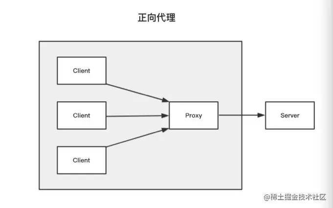 nginx 就是充当图中的 proxy。左边的3个 client 在请求时向 nginx 获取内容,server 是感受不到3台 client 存在的。
