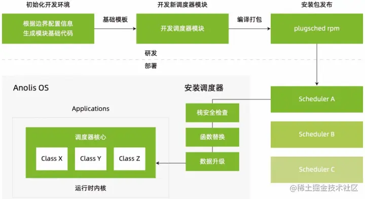 调度器热升级 SDK 通过模块化、数据重建、热替换等技术,实现调度器研发、测试、上线、维护的敏捷化和定制化。其中,模块化技术自动地从内核中解耦出调度器模块代码,面向内核开发者提供敏捷开发的 SDK 。热替换技术使得管理员可在毫秒级 downtime 内部署。数据重建技术将数据状态从升级前的调度器迁移到升级后的调度器。通过这些技术,可以实现定制化调度器,从而解决不同应用和负载需要不同调度器的问题,并实现生产可用。相关论文「Efficient Scheduler Live Update for Linux Kernel with Modularization 」已经发表在体系结构顶会 ASPLOS '23 上。软件架构如下图所示: