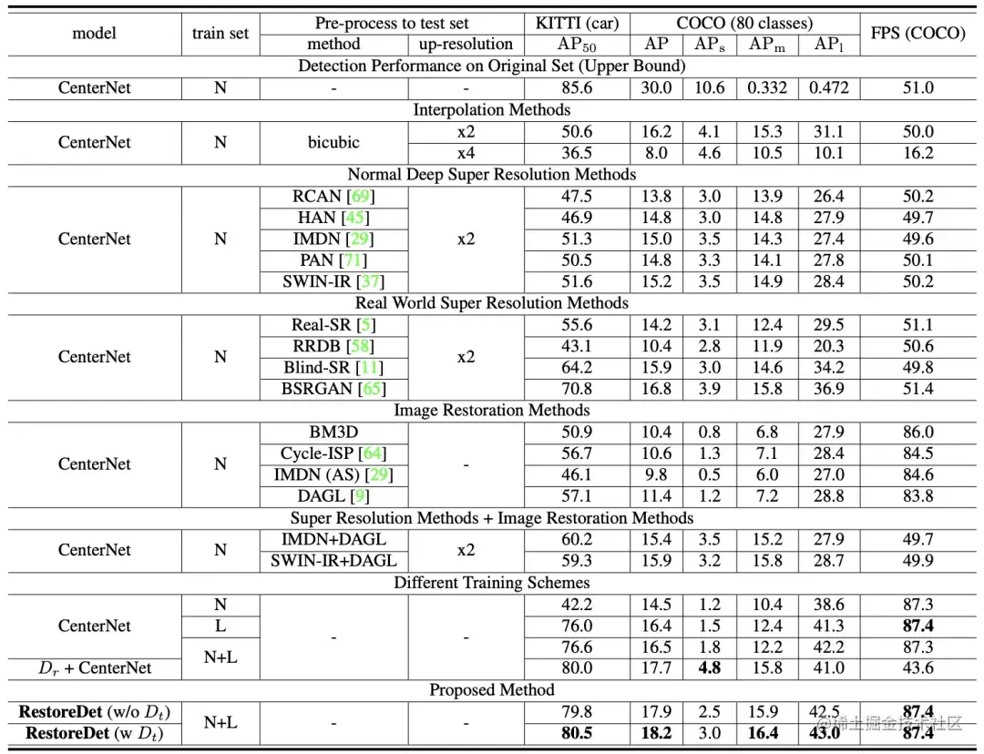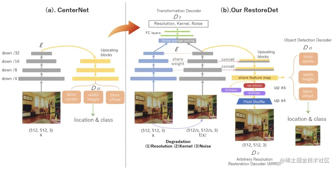 上图(a)是anchor free框架的CenterNet。图(b)说明了如何基于CenterNet实现的RestoreDet。详细的训练过程在Algo.1中给出。在训练RestoreDet时,原始HR图像x和变换后的退化LR图像t(x)被发送到编码器E以对退化等变表示进行编码。在这里,直接使用CenterNet的编码器E,但将其复制到共享权重Siamese结构中,分别接收HR和LR图像。