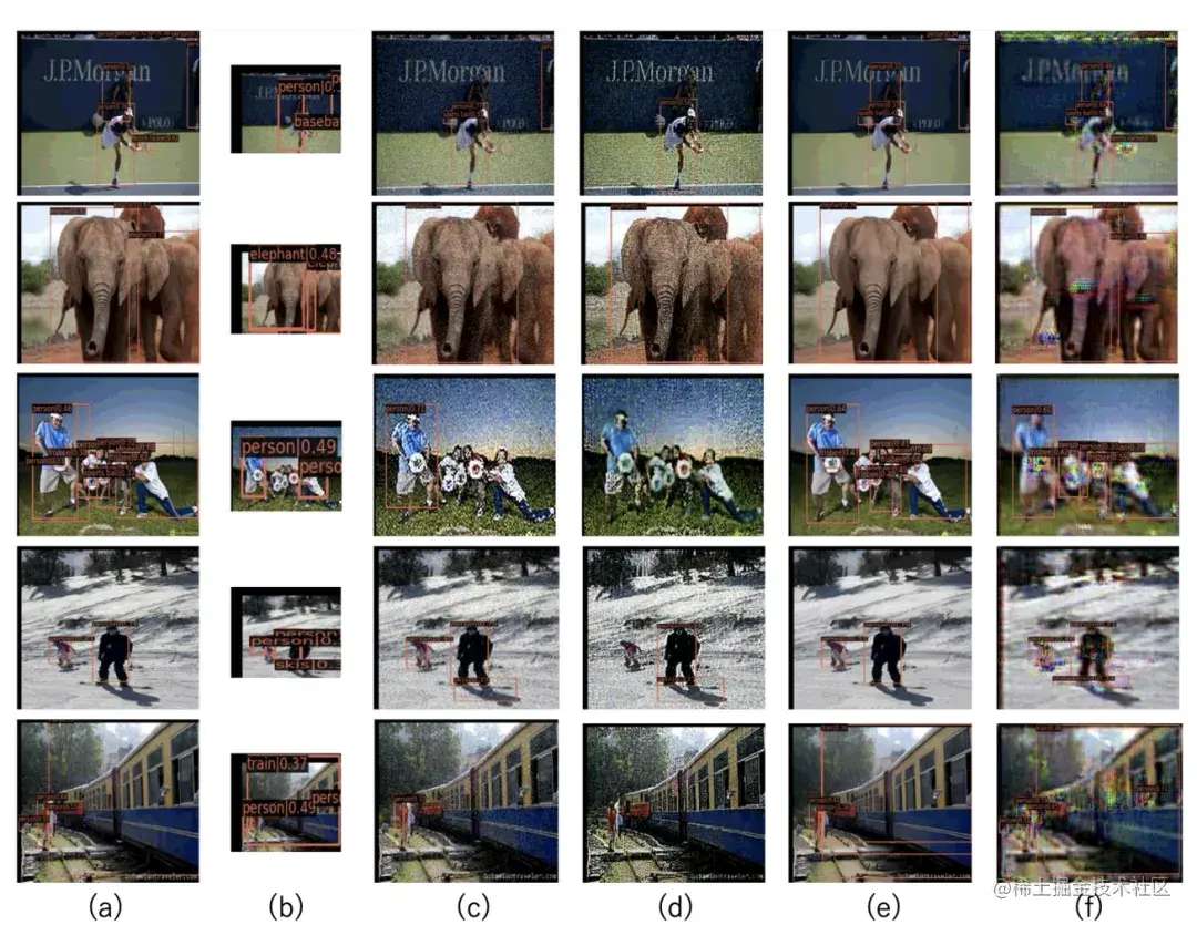 (a)/(b) is CenterNet trained on normal images and tested on normal/degraded down4 testset, (c)/(d)/(e) is CenterNet tested on the degraded image restored by individual SR algorithm RRDB/RealSR/BSRGan. (f) is the detection result of our RestoreDet and we use the output of ARRD Dr as background images.