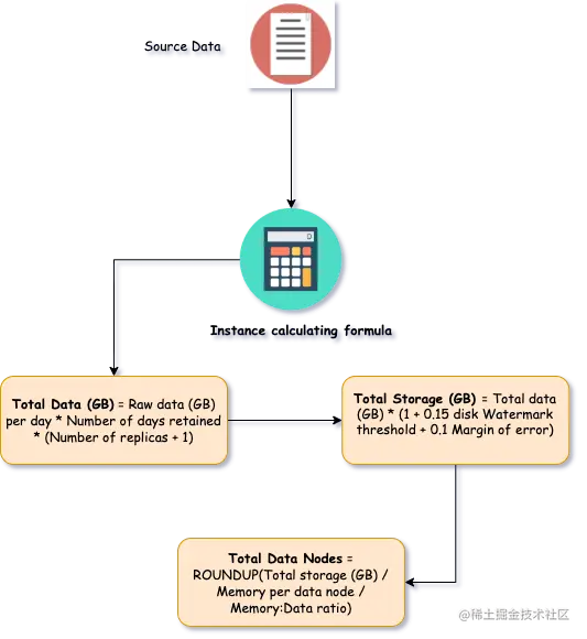 2. Total Storage (GB) = Total data (GB) * (1 + 0.15 disk Watermark threshold + 0.1 Margin of error)