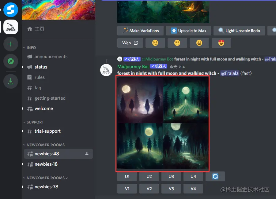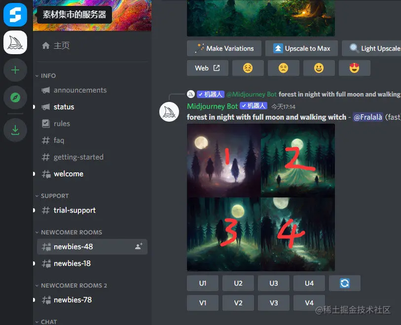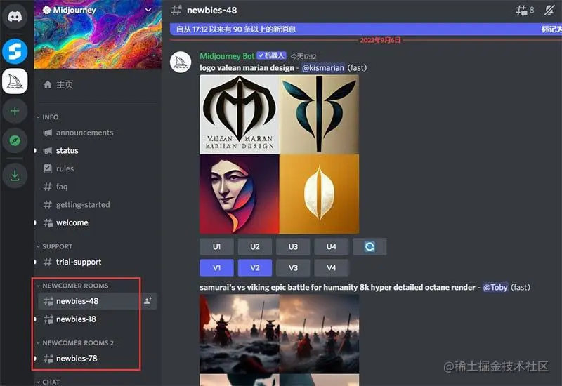 进入Midjourney频道, 选择频道栏 #Newbies-xx,进入新手测试频道。