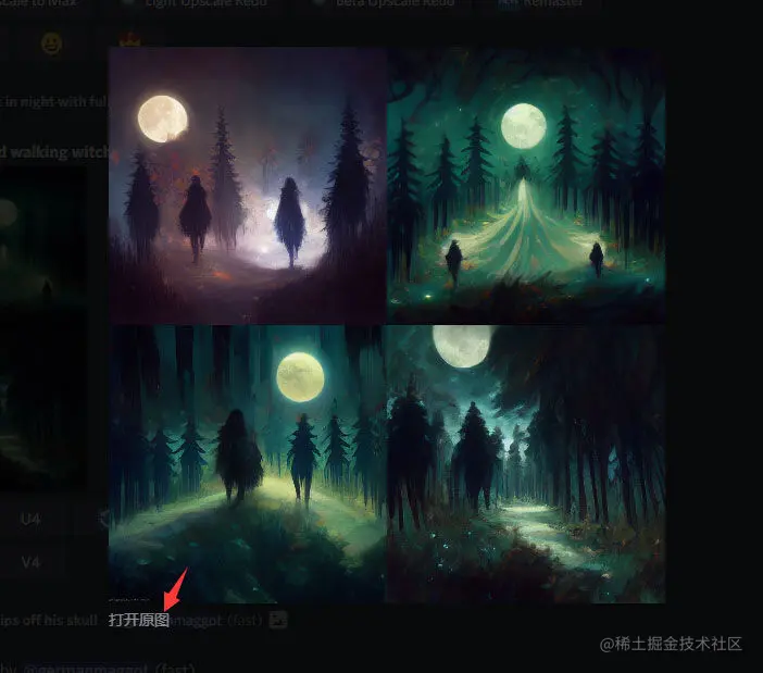 7. 生成完成后,会出现两排按钮,U是放大图片,U1\U2\U3\U4分别指的是放大四张图片中的某一张,V是采用图片的构图形式,重新生成,顺序参考如下图。