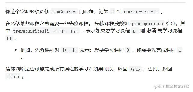 如果 课程完成 不了 , 则表示 出现了 循环依赖 , 如何通过拓扑序判断这种循环 依赖的关系呢? 记录点是否都进行过一次入队操作,若 所有点都进行了一次入队操作,则没有产生循环依赖,反之. (因为入度不为0的点 , 我们不让他入