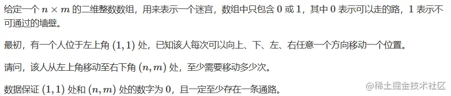 - 思路 : 从 (1,1) 点位出发 , 上下左右任意一个方向(方向数组技巧), 至少 BFS 通常用在最短路。