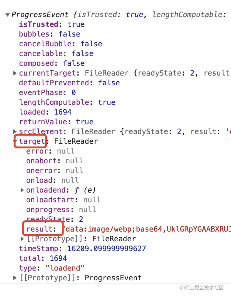 result 值的获取,则是通过 FileReader 的 onloadend 事件,在文件读取结束之后,被包含在 ProgressEvent ******对象,在该对象的 target 属性下。