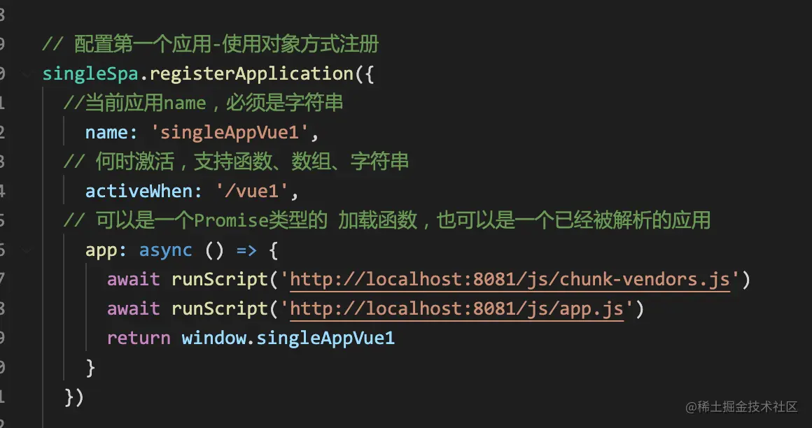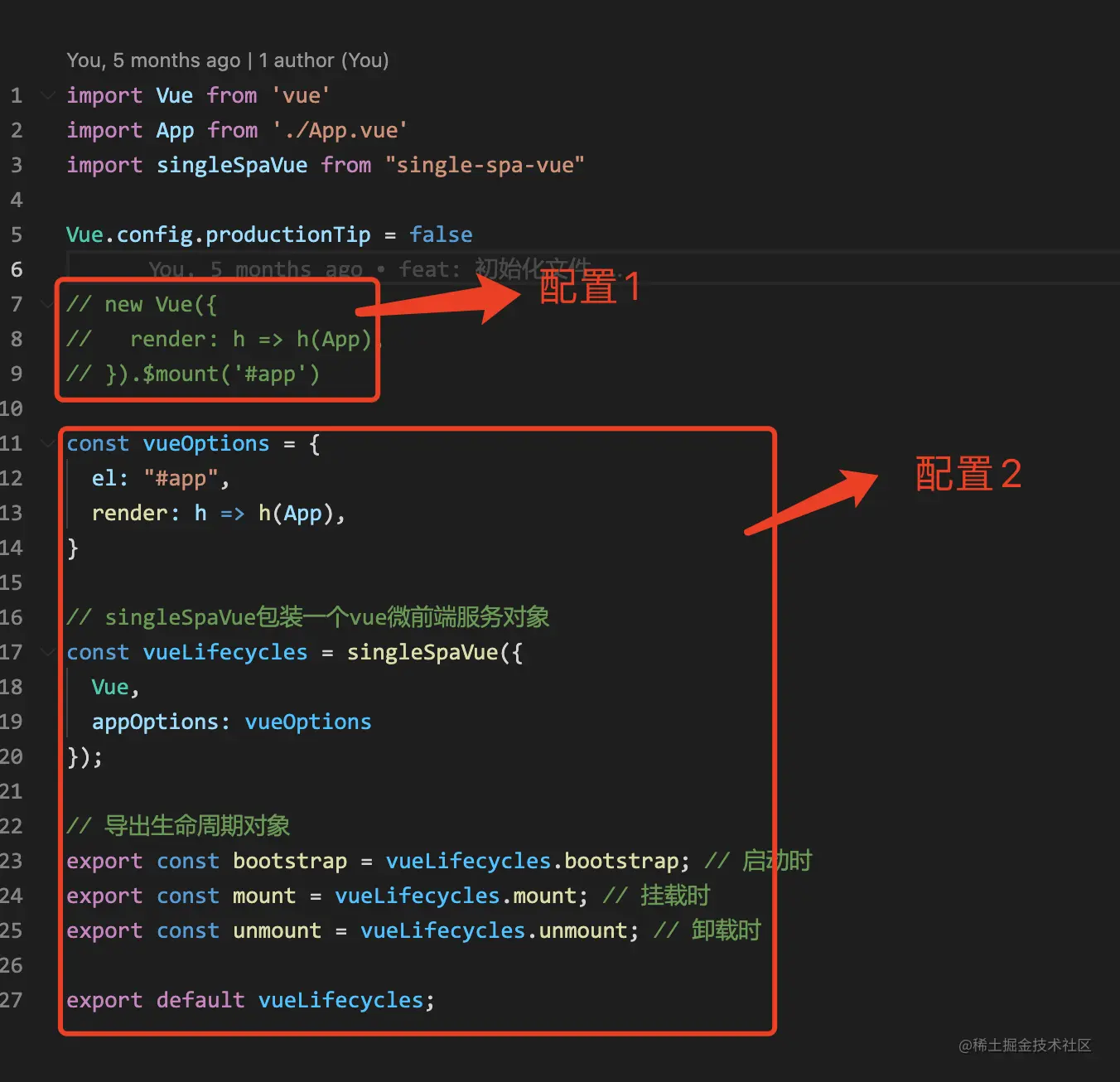 在配置2中我们会把当前vue的配置传给single-spa-vue函数库中。包括el、render方法、Vue对象。通过singleSpaVue的包装,返回single-spa生命周期方法bootstrap、mount、unmount。