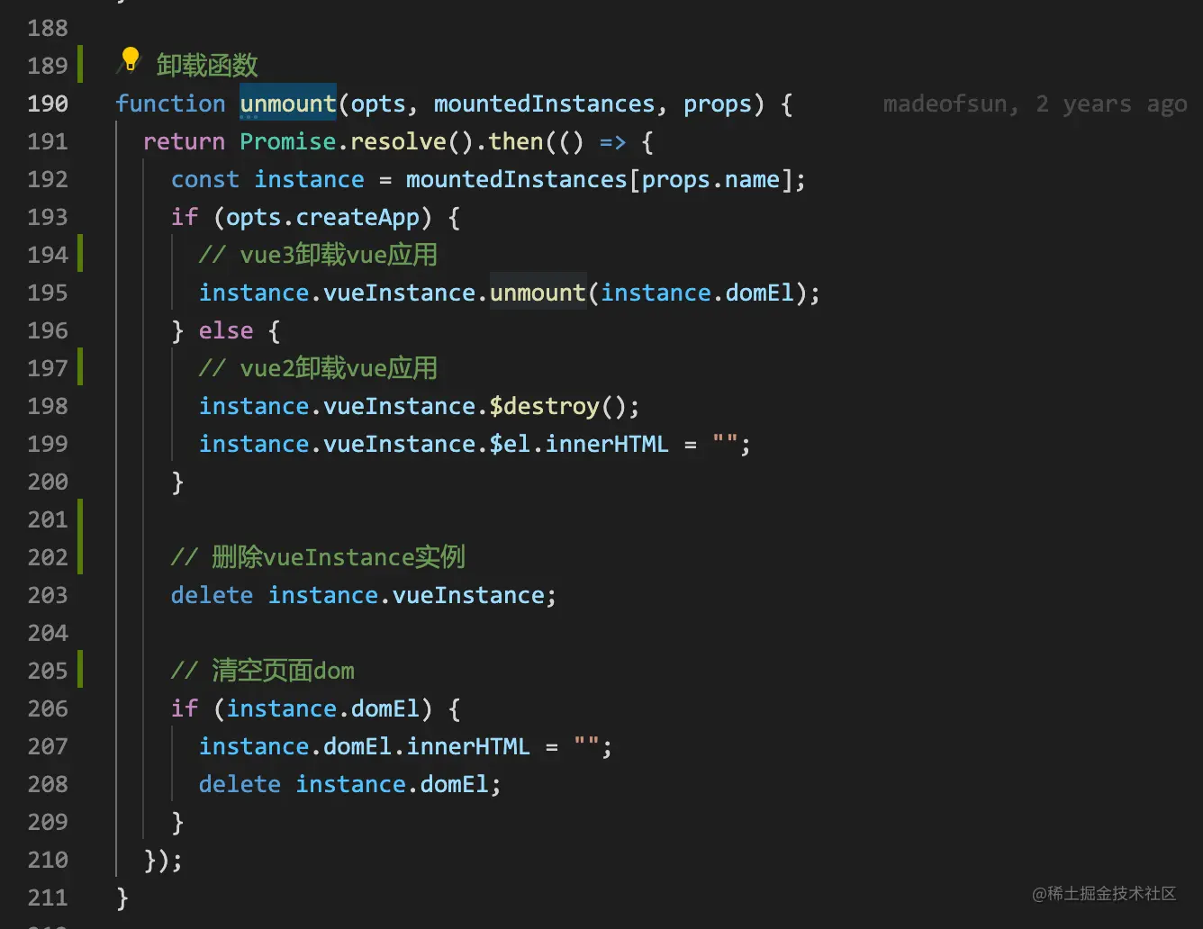 - unmount:卸载函数,子应用每次被卸载的时候都会执行。