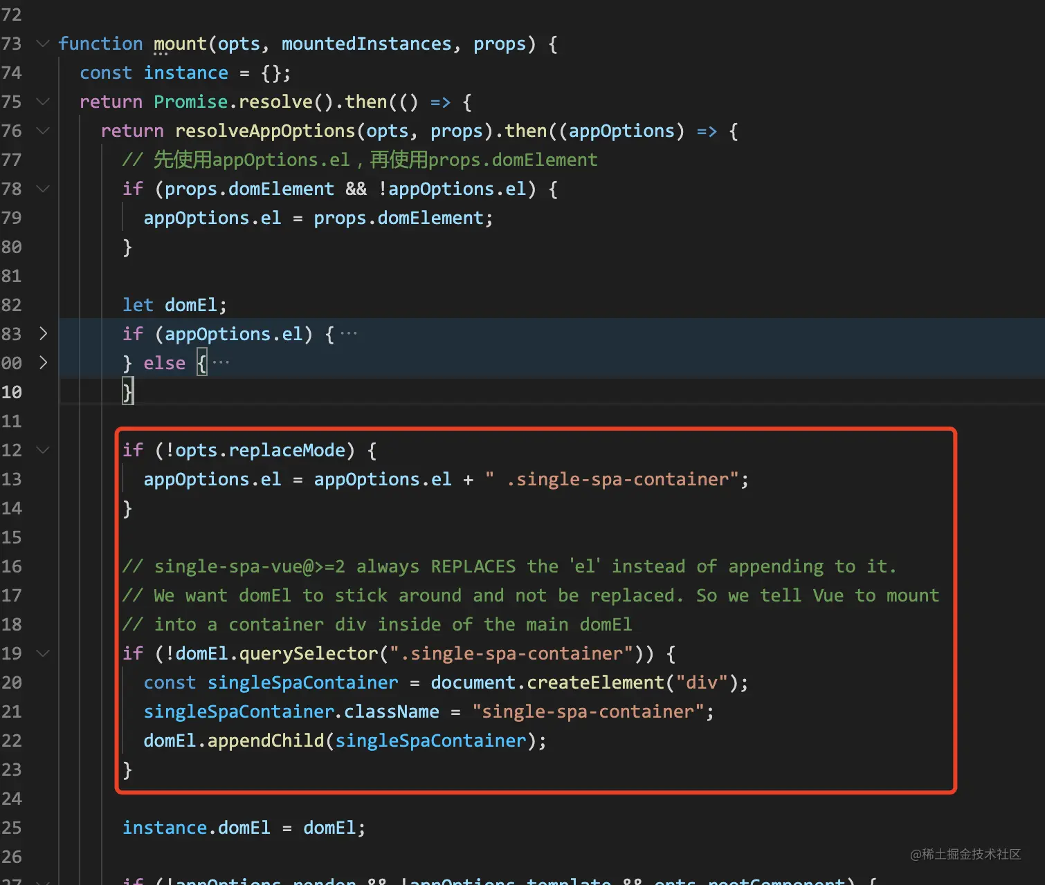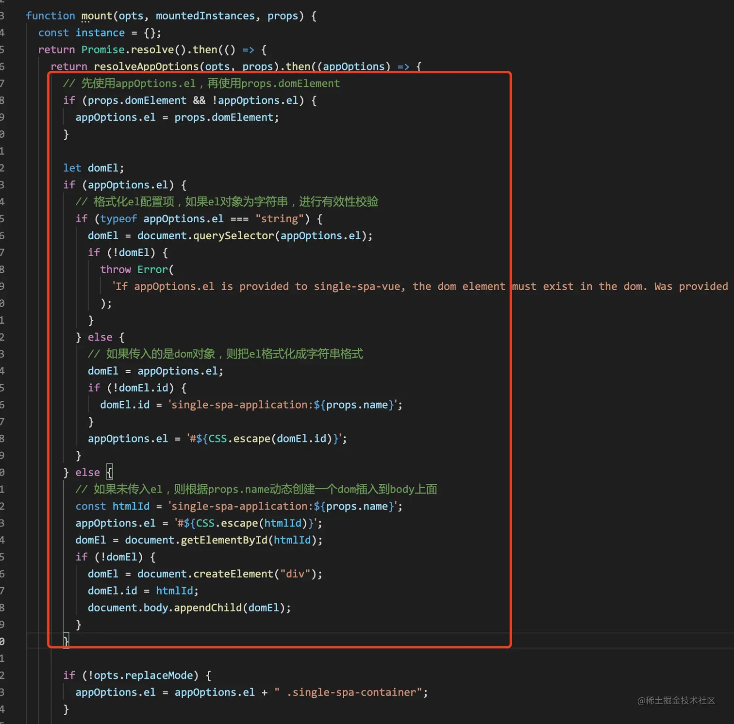 在子应用每次被挂载到页面上的时候,single-spa会执行mount生命周期函数,single-spa-vue在mount函数中用来初始化子应用的vue实例,并且把实例挂载到页面上。