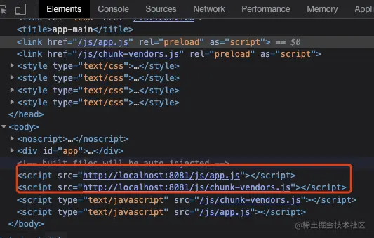 基座应用中配置的加载子应用配置,在配置子应用对象的app方法中会把子应用chunk-vendors.js、app.js插入到页面,并且执行chunk-vendors.js、app.js两个子应用依赖的js。
