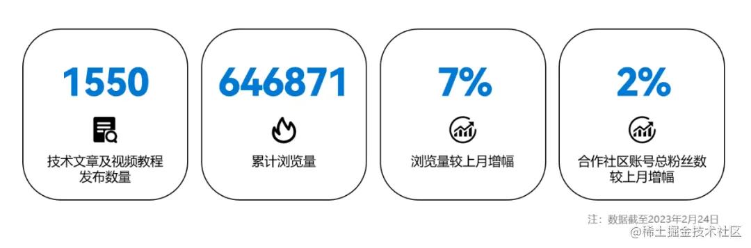 截至2023年2月24日,9个合作社区共发布内容(含技术文章、视频教程)1550篇,累计获得总PV/UV数646871,同比上月增长7%,账号获得粉丝数1401人,较上月增幅2%。
