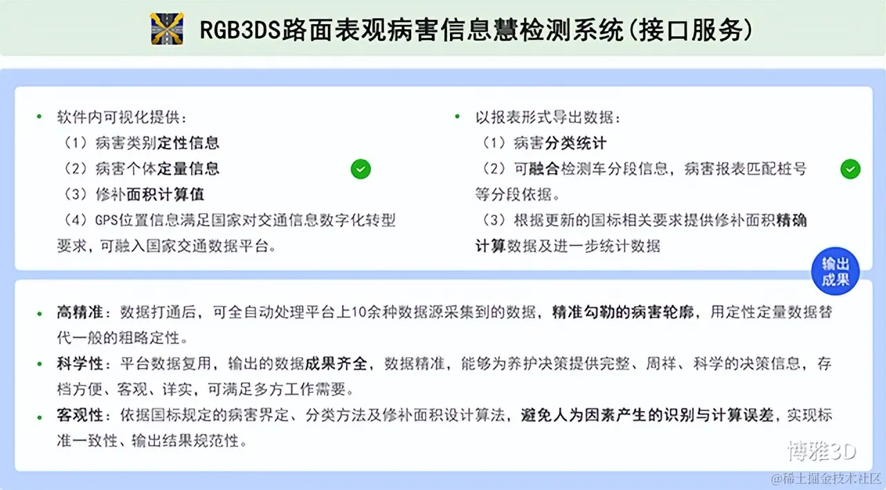 【RGB3DS道路表观病害信息智慧检测系统】接口服务拥有丰富度高、科学有效的输出成果,且满足定制化需求。