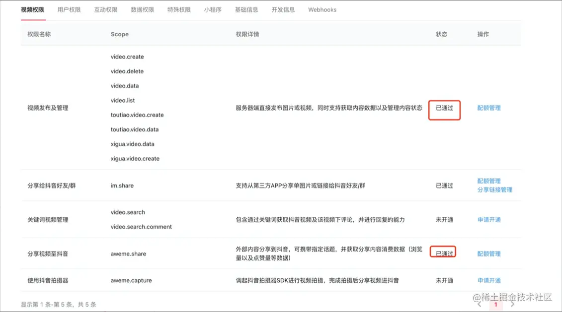 抖音需要相册权限,即使是网络图片,也是先把网络图片下载到相册,然后调用的抖音SDK接口进行分享,还有可能是在抖音上没有开通权限,还要点击后面的配额申请配额: