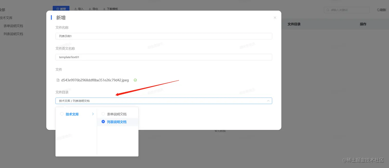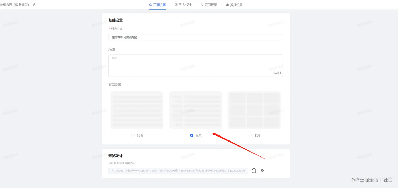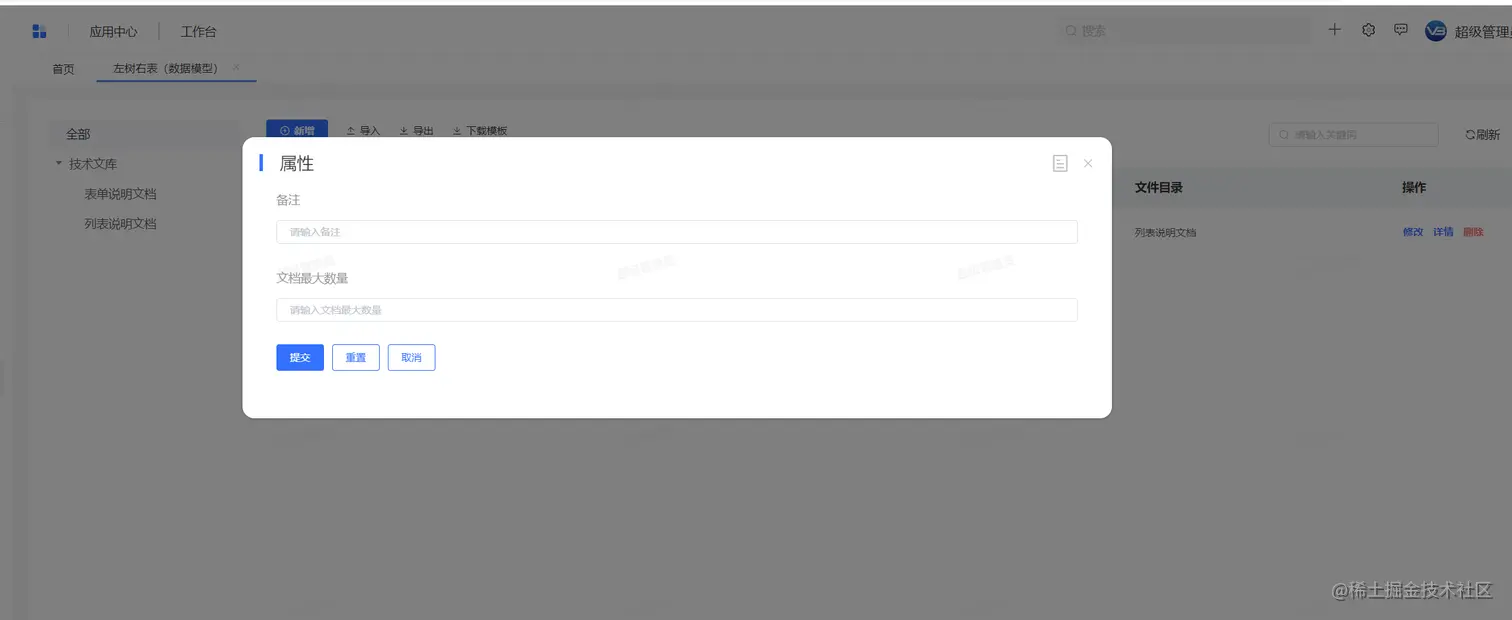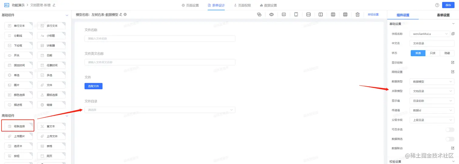 2、新建列表页(左树右表),页面设置中布局设置选择目录,字段中加入树模型字段。在新增表单中,树字段使用级联选择组件,数据类型选择数据模型,关联模型选择树模型(此处为文档目录),传递值选择数据id。