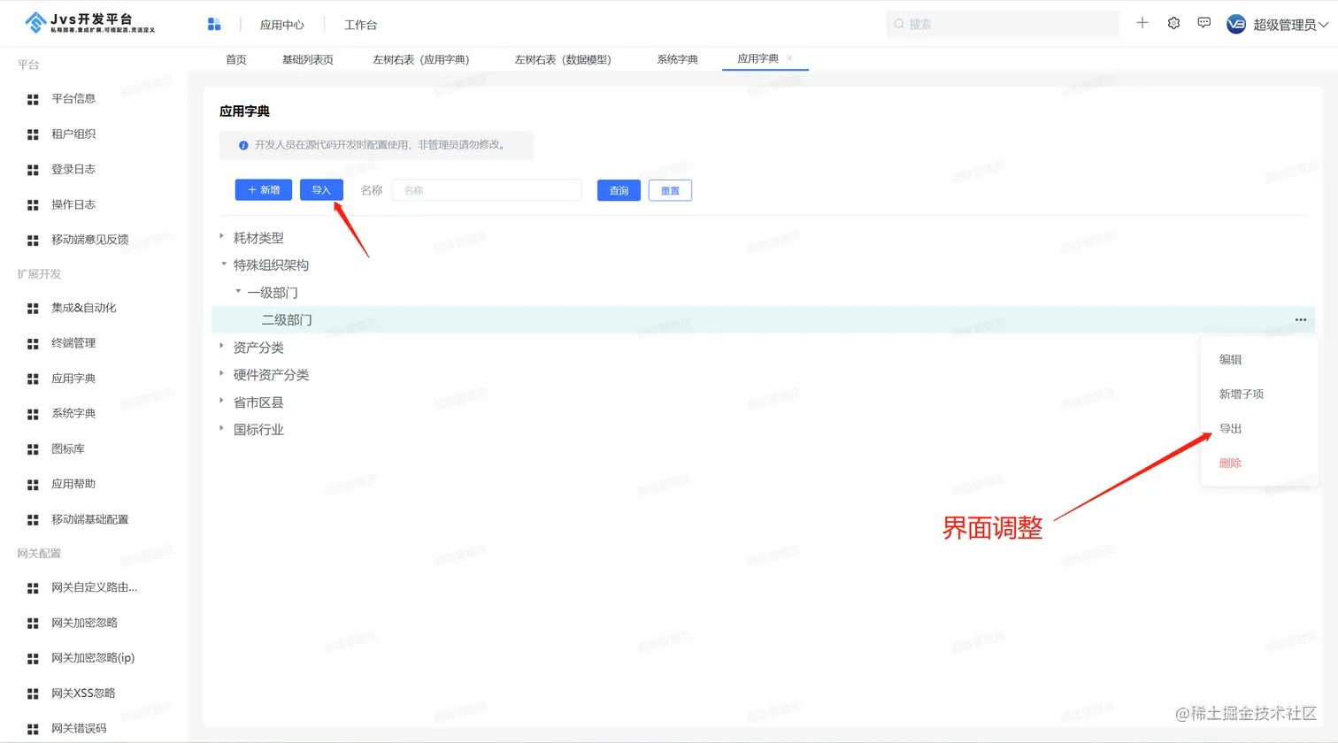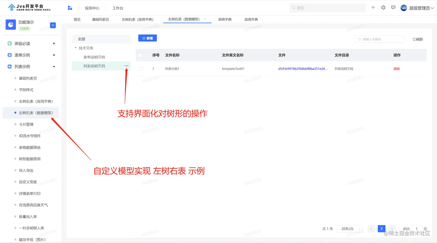 实现树形的配置有两种模式,一种是根据树形字典配置(简单导入即可),这种配置简单,把静态的树形字典导入到系统中,一种是以纯配置的形式(根据业务灵活调整),实现一个树形字典的数据模型,再根据左树右表的方式配置。