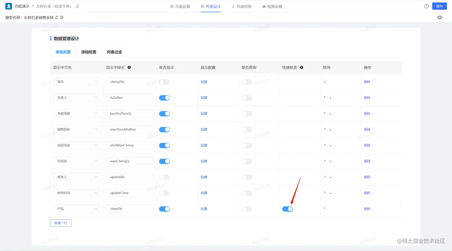 3、保存表单后回到列表页,刷新重新加载列表设计页面,可以看到树模型字段出现可开启“快速检索”开关,打开开关。返回列表页面(此处为文件管理页面)即可新增数据,选择对应目录会将数据绑定到对应树节点中。
