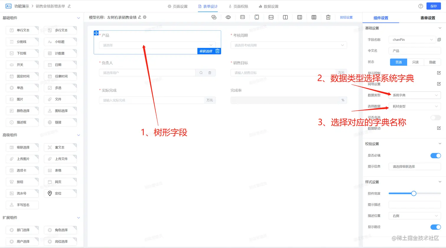此处配置一个表单,设计表单修改一些字段属性。在此示例中,属性表单修改的数据为树模型中字段的数据。
