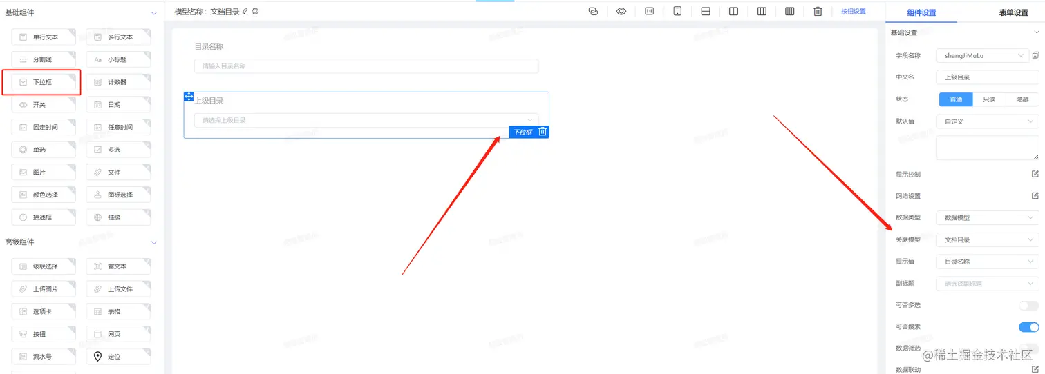 1、创建树模型,这个模型是可以根据业务需求灵活独立创建,在模型新增表单中配置相关组件,注意父级目录字段使用下拉组件关联当前模型(此处为文档目录)。