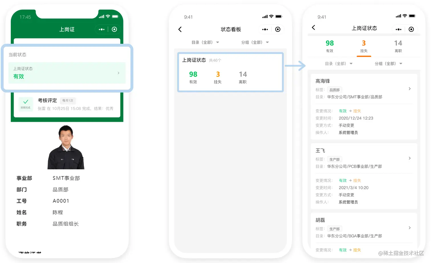 为每个人员二维码设置状态,管理人员可在小程序工作台中查看不同状态的上岗证数量、详情和变更历史。