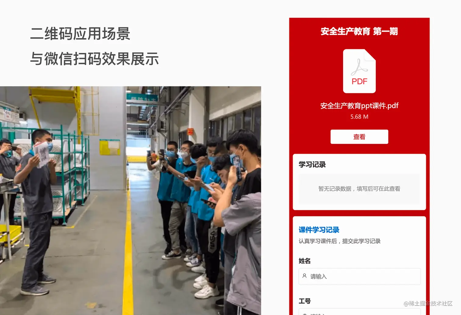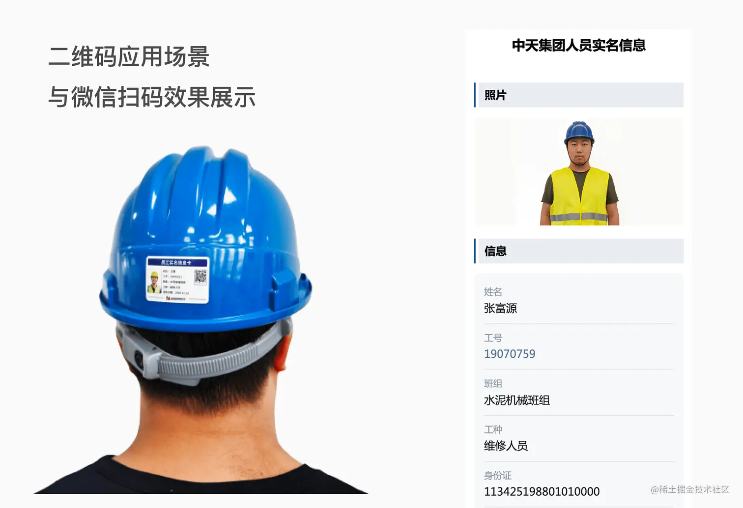 建筑工地等需要实名管理的场所,将二维码贴在安全帽或工牌上,扫码判断该人员是否属于现场人员、是否通过安全教育,省去翻阅资料比对的繁琐流程。