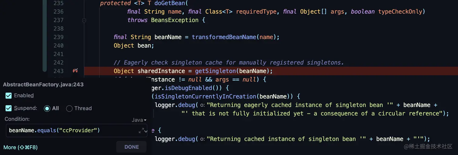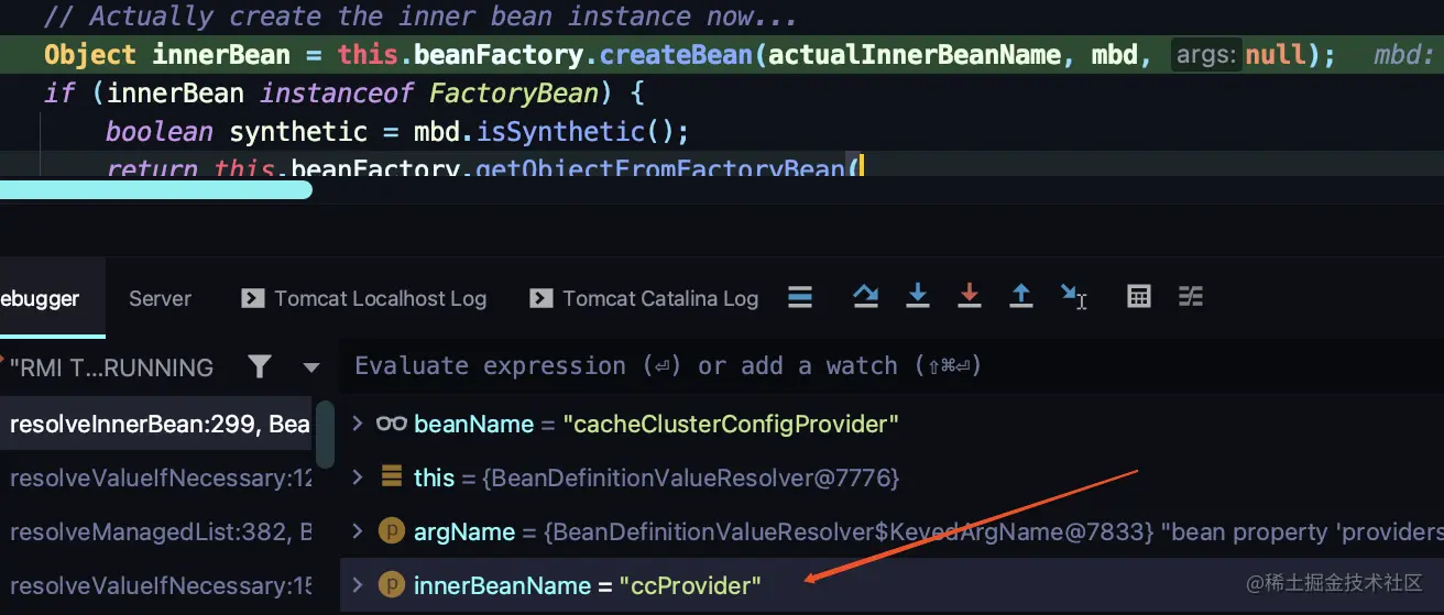 从 debug 中也可以看到真正要创建的 beanName 已经换成了我们的想要装配的属性ccProvider