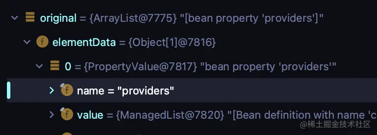 从 debug 中也可以看出,我们 bean 的属性只有一个,也就是providers,符合我们在上面 xml 中配置的属性