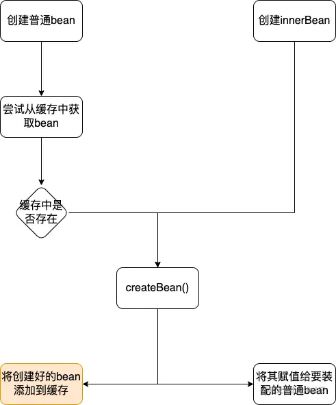 而创建innerBean则基于createBean() 原子性操作前提,只会返回创建好的 bean,并不会将其加入到 spring 的 bean 缓存中,因此也就不存在 beanName 重复的问题了