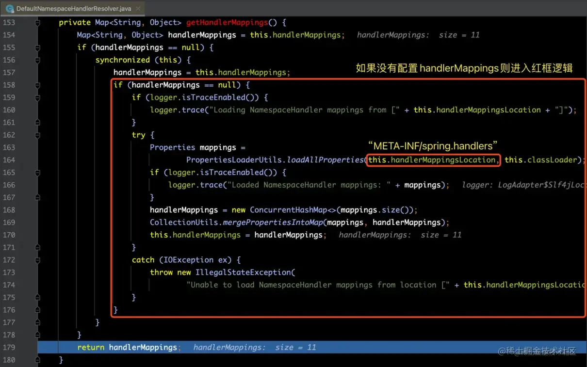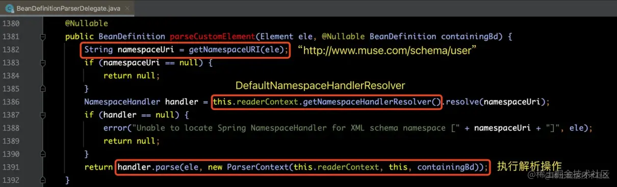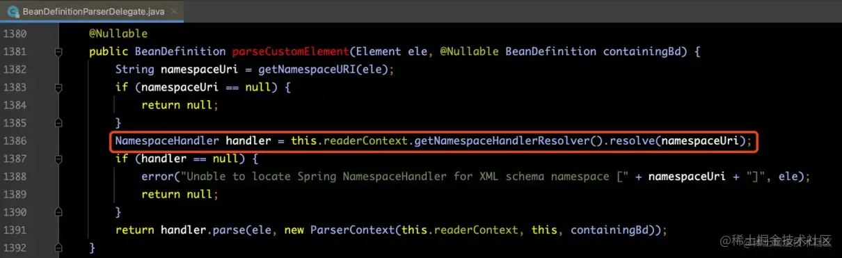 此方法是用来获得解析该自定义标签的 NamespaceHandler 实现类,为下图中红框处代码: