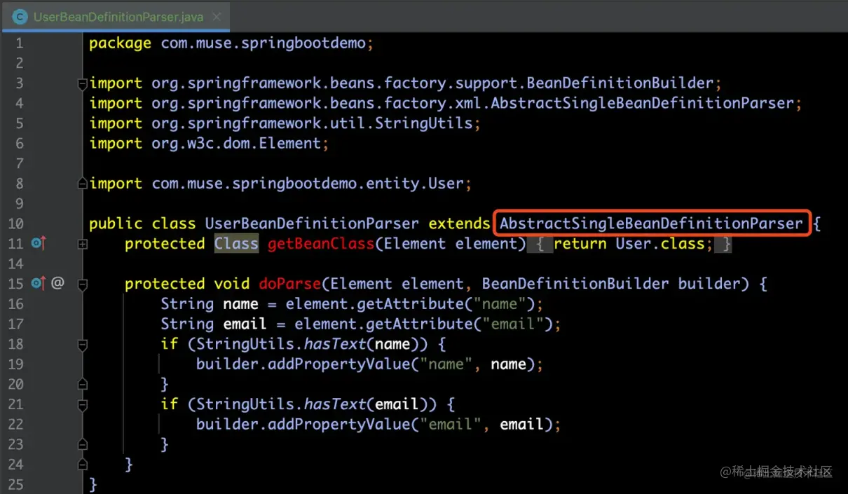 在doParse(element, parserContext, builder)方法中,执行了真正的自定义标签解析逻辑,那么既然是自定义标签,是无法通过 Spring 进行解析的,而是需要我们自己提供自定义解析类XxxBeanDefinitionParser来实现doParse(...)方法的,具体如下所示: