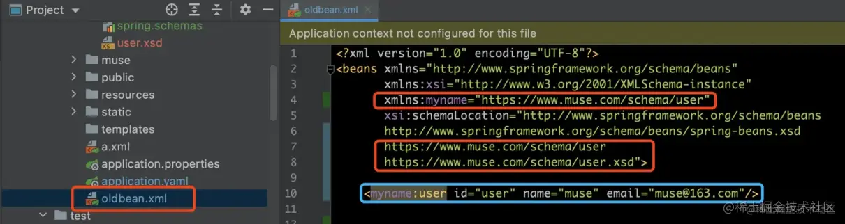 步骤 6:在配置文件oldbean.xml中引入对应的命名空间以及 XSD 之后,就可以配置<myname:user ... />了