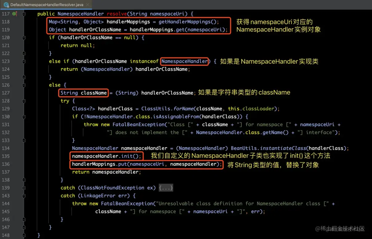 上面我们了解了 DefaultNamespaceHandlerResolver 实例对象的创建过程之后,那么下面我们就来分析一下它的resolve(namespaceUri)这个方法的内部实现,下面是该方法的源码部分: