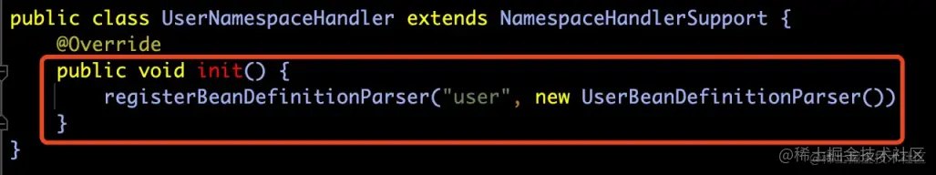 那么在调用 namespaceHandler.init() 方法的时候,其实调用的是UserNamespaceHandler实例的init()方法,该方法是我们自己实现的。如下图所示: