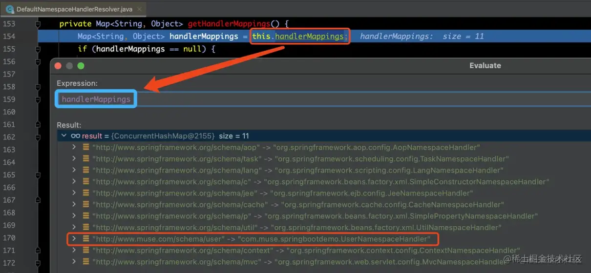 当我们调用 handlerMappings.put(namespaceUri, namespaceHandler) 方法时,那么就将原本 String 类型的 value 值“com.muse.springbootdemo.UserNamespaceHandler”,替换为UserNamespaceHandler实例对象了。如下图所示: