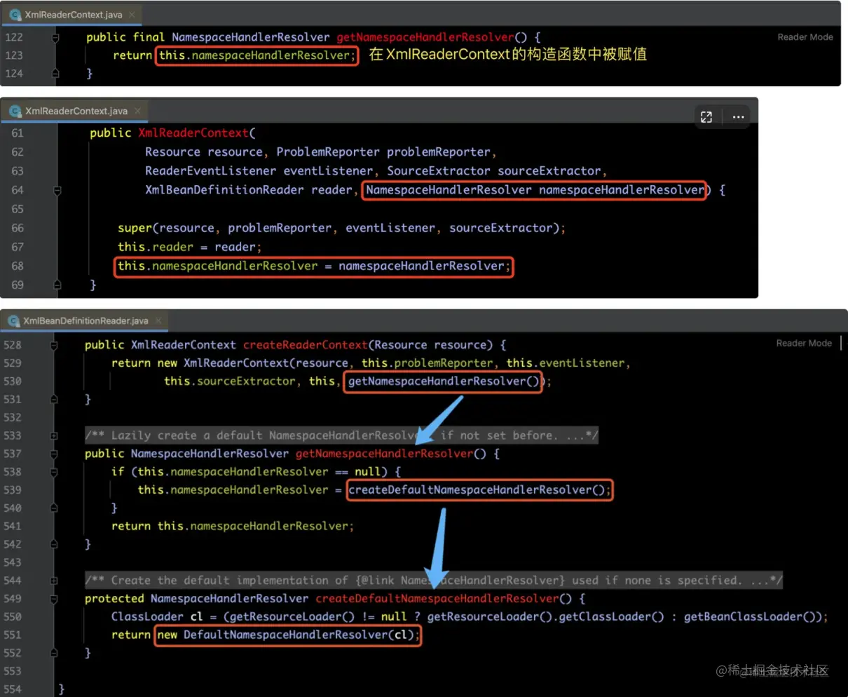 在此处的this.readerContext.getNamespaceHandlerResolver()方法中,实际会返回 DefaultNamespaceHandlerResolver 实例对象。