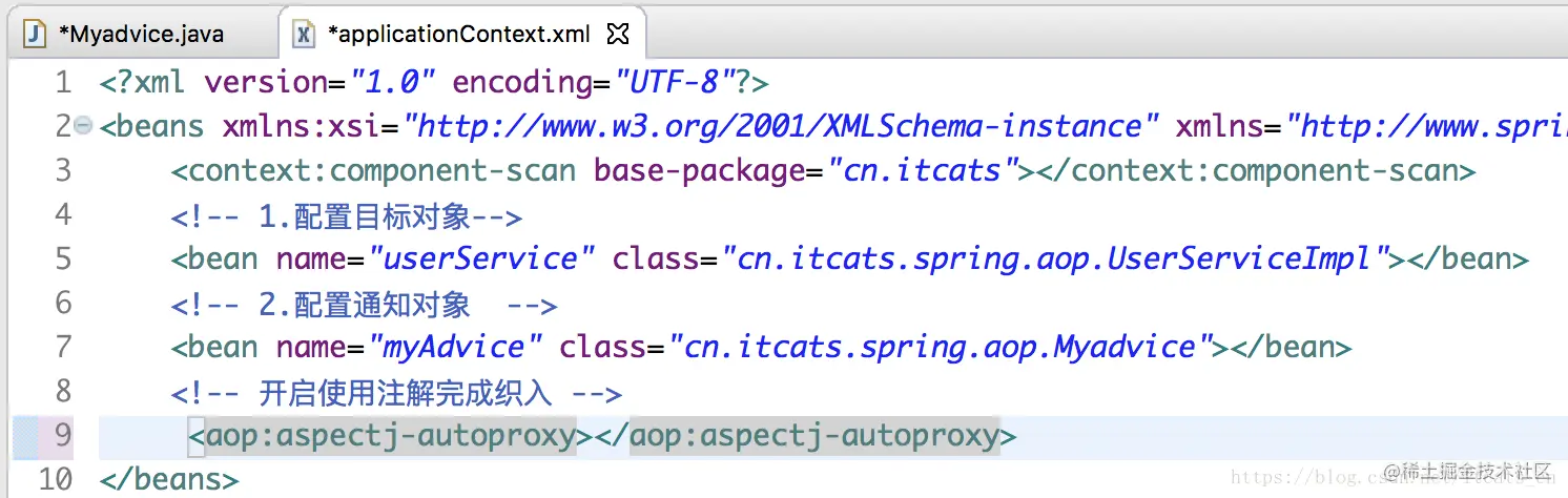 1、applicationContext.xml中配置目标对象,通知对象,开启使用注解完成织入
