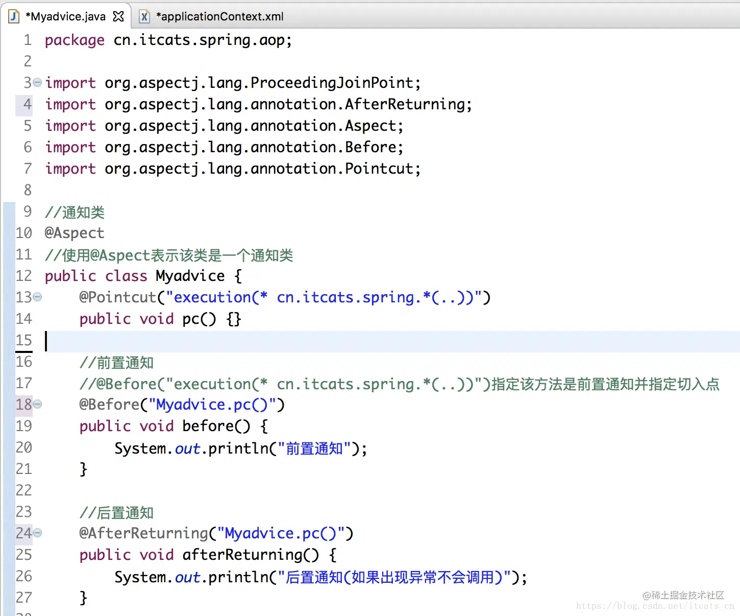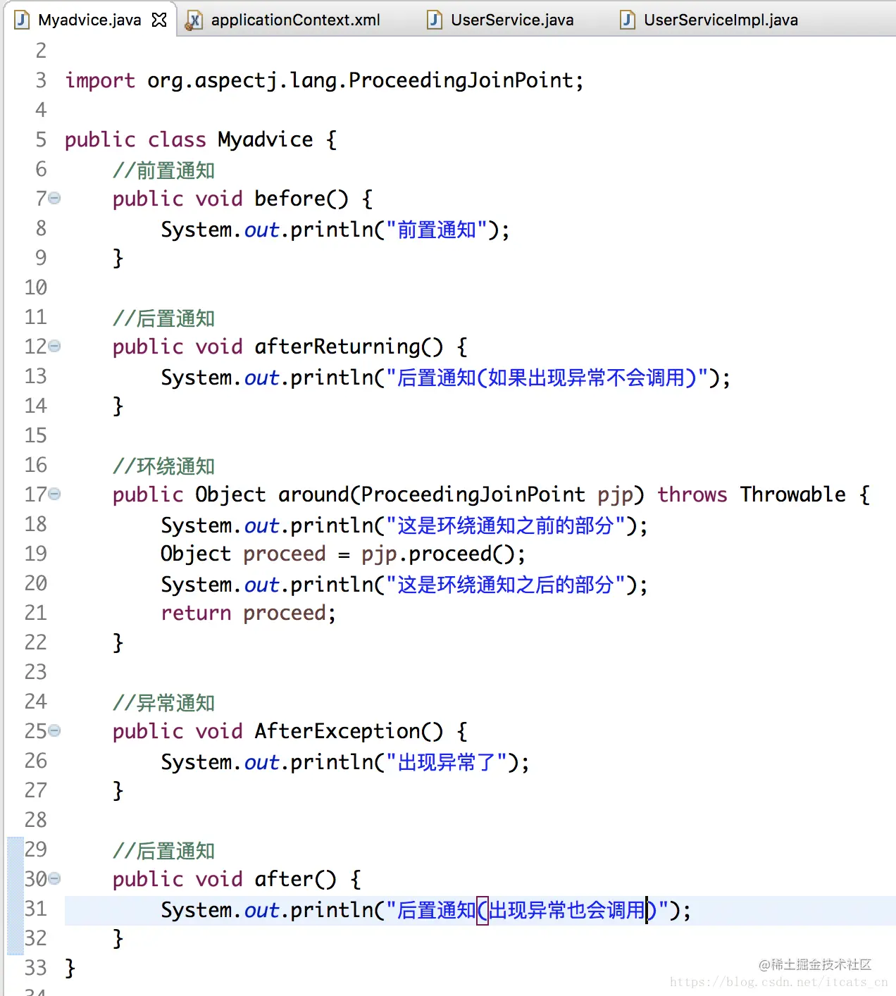 这里牵扯区别这两个类:Proceedingjoinpoint 继承了 JoinPoint 。是在JoinPoint的基础上暴露出 proceed 这个方法。proceed很重要,这个是aop代理链执行的方法。暴露出这个方法,就能支持 aop:around 这种切面(而其他的几种切面只需要用到JoinPoint,这跟切面类型有关), 能决定是否走代理链还是走自己拦截的其他逻辑。建议看一下 JdkDynamicAopProxy的invoke方法,了解一下代理链的执行原理。这样你就能明白 proceed方法的重要性。@After 后通知(After advice) :当某连接点退出的时候执行的通知(不论是正常返回还是异常退出)。
