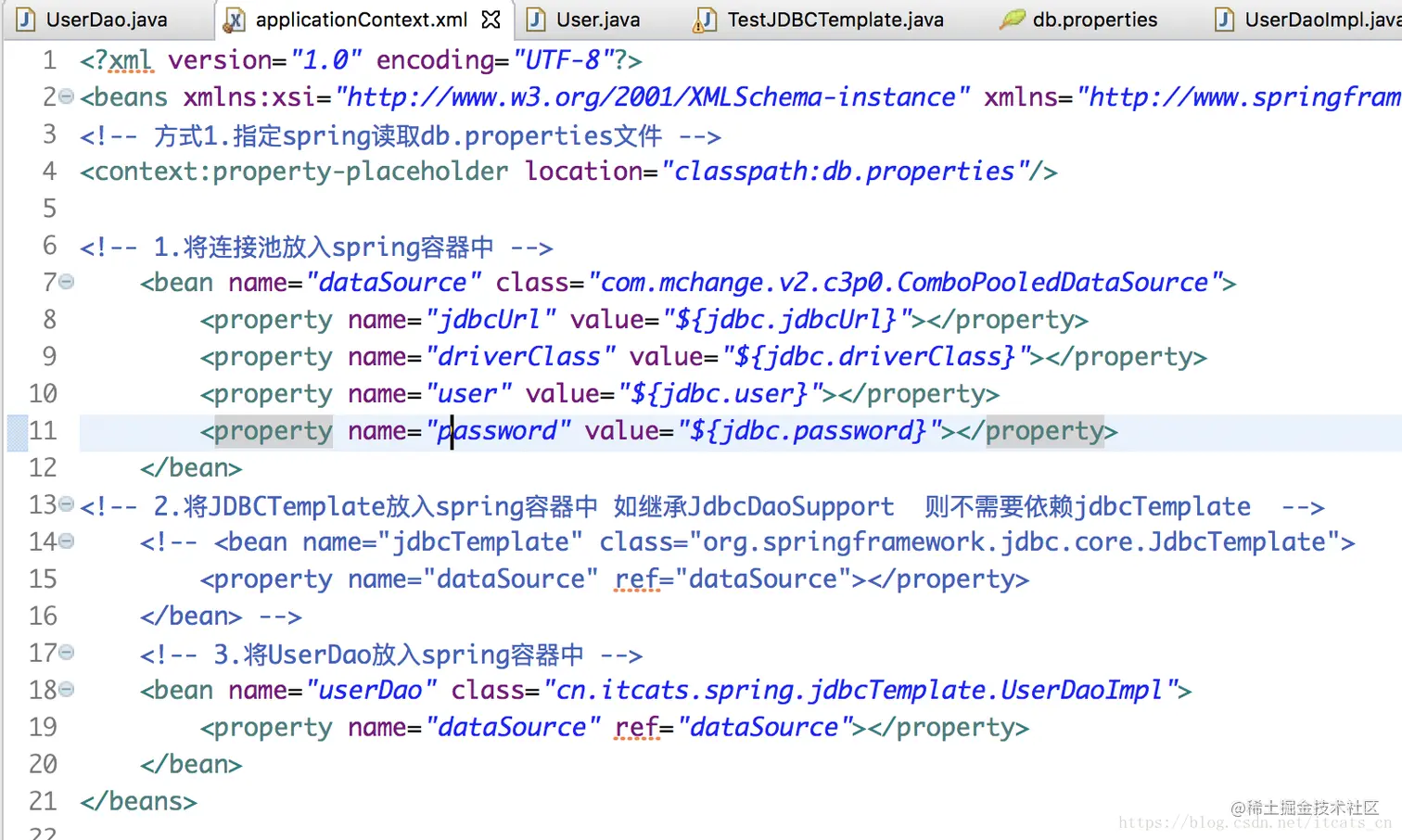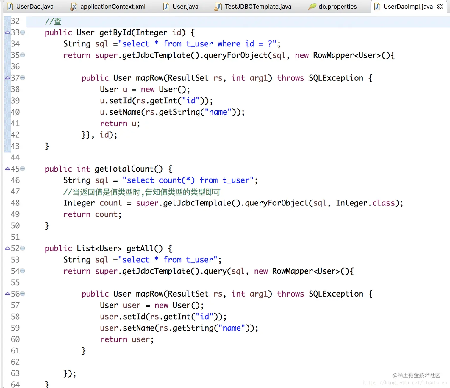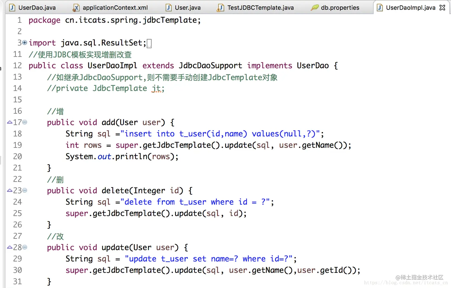spring中提供了一个可以操作数据库的对象,对象封装了jdbc技术 ————JDBCTemplate JDBC模板对象,而JdbcDaoSupport则对JdbcTemplate进行了封装,所以要操作JdbcTemplate,或只需要继承JdbcDaoSupport即可。