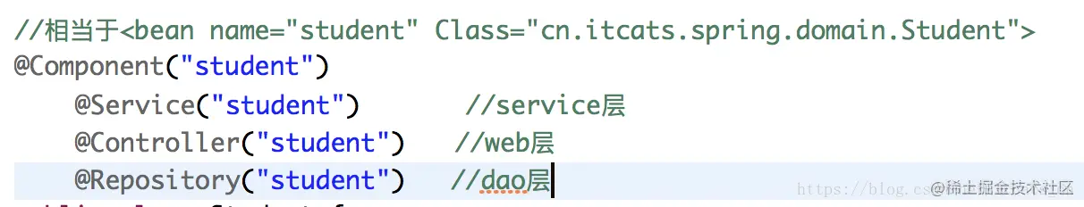 比如Student类中使用了@Component 没有书写括号和值,那么默认搜索id或name为student。